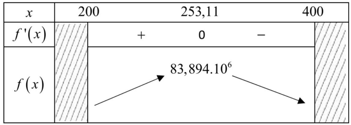 f(x)=−0,96x3−823x2+667800x−11500−3x+2200000x2⇒f′(x)=−2,88x2−1646x+667800−(3x+2)2600000x2+800000x⇒f′(x)=0⇔x≈253,11.