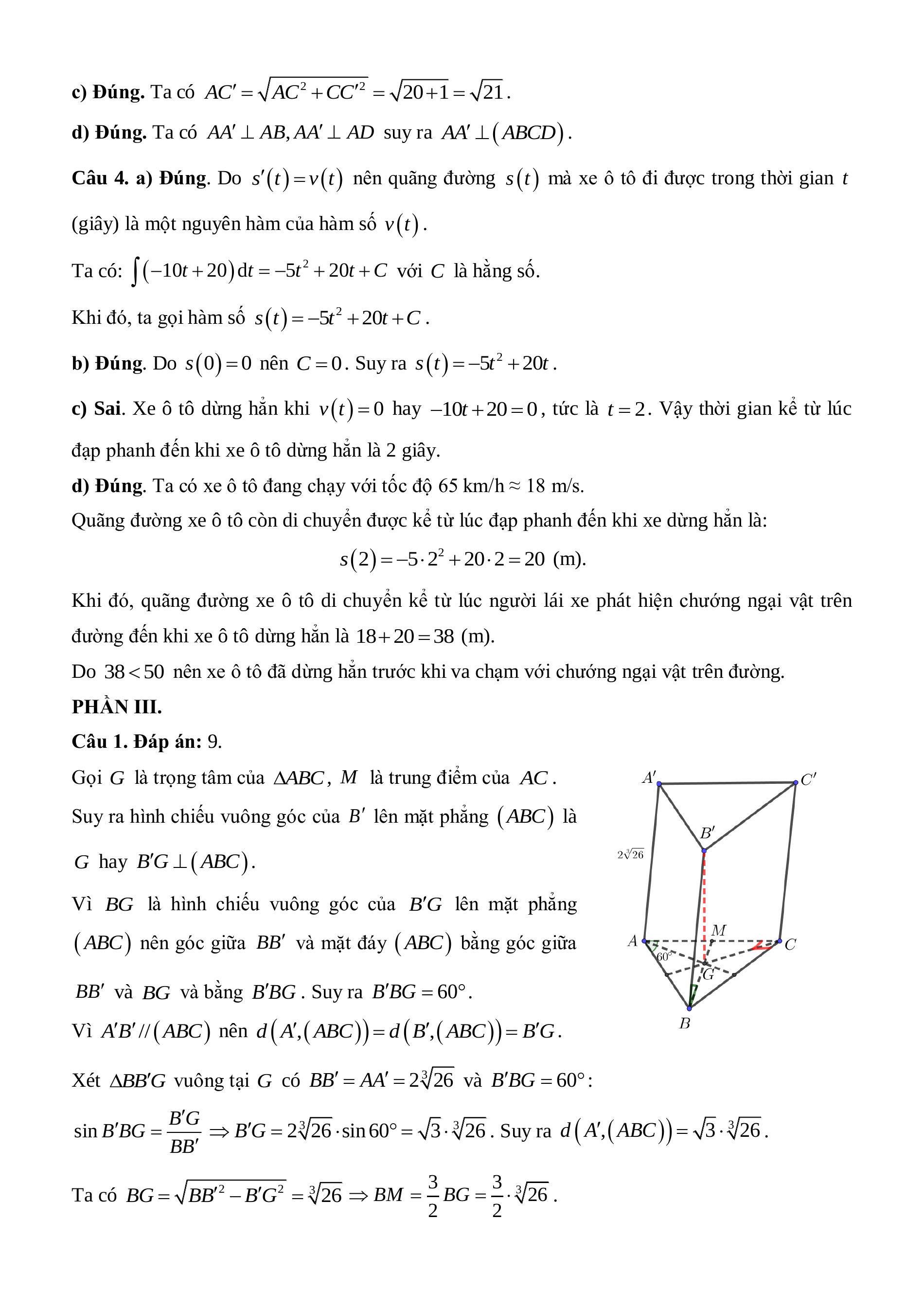 Câu 1. Cho hình lăng trụ ABC⋅A′B′C′ có AA′=2326, tam giác ABC vuông tại C và BAC=60∘, góc giữa cạnh bên BB′ và mặt đáy (ABC) bằng 60∘. Hình chiếu vuông góc của B′ lên mặt phẳng (ABC) trùng với trọng tâm của tam giác ABC. Tính thể tích của khối tứ diện A′ABC.
