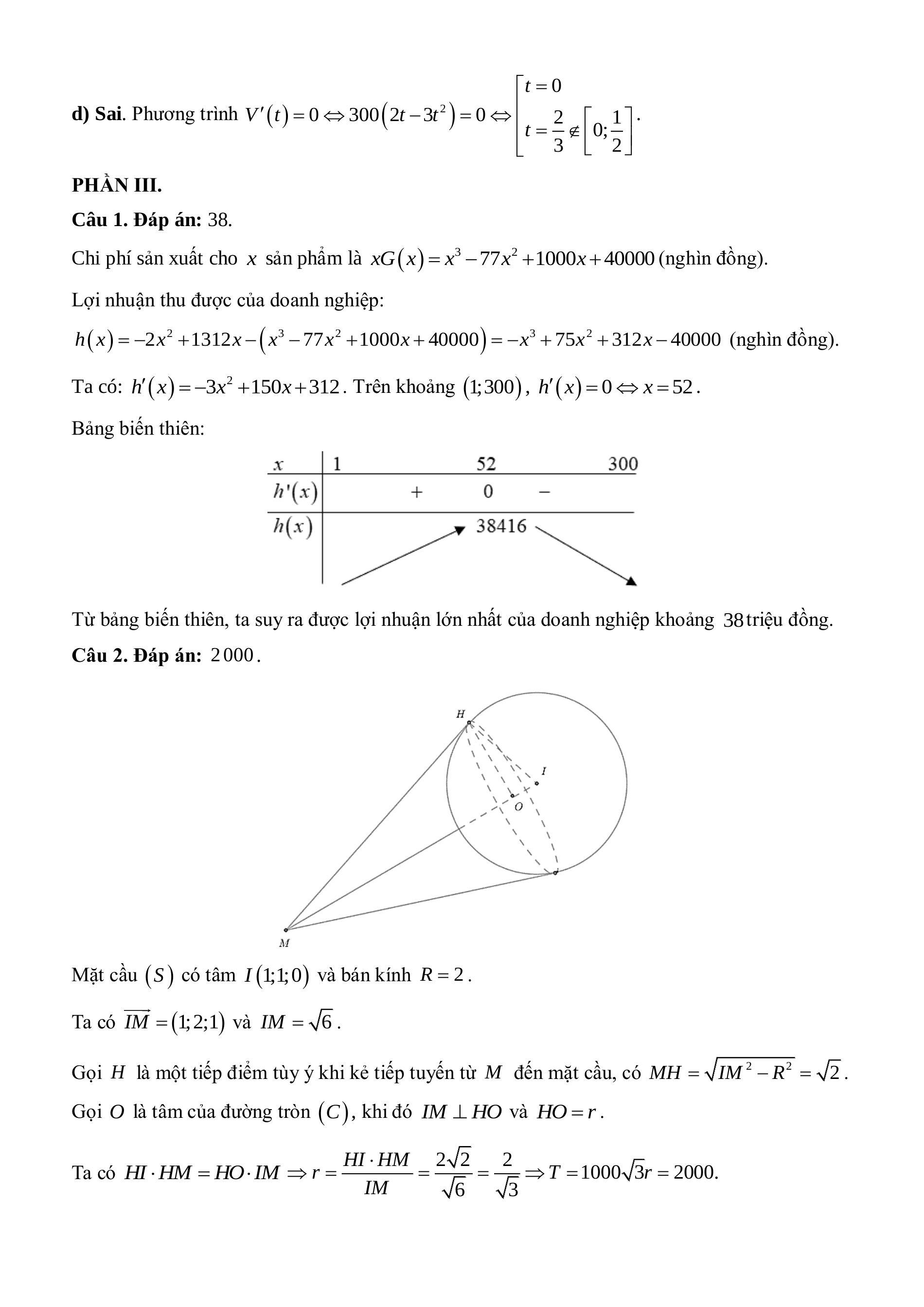 Câu 2. Trong không gian với hệ tọa độ Oxyz, cho mặt cầu (S):(x−1)2+(y−1)2+z2=4 và một điểm M(2;3;1). Từ M kẻ được vô số các tiếp tuyến tới (S), biết tập hợp các tiếp điểm là đường tròn (C). Gọi r là bán kính của đường tròn (C). Tính T=10003r.