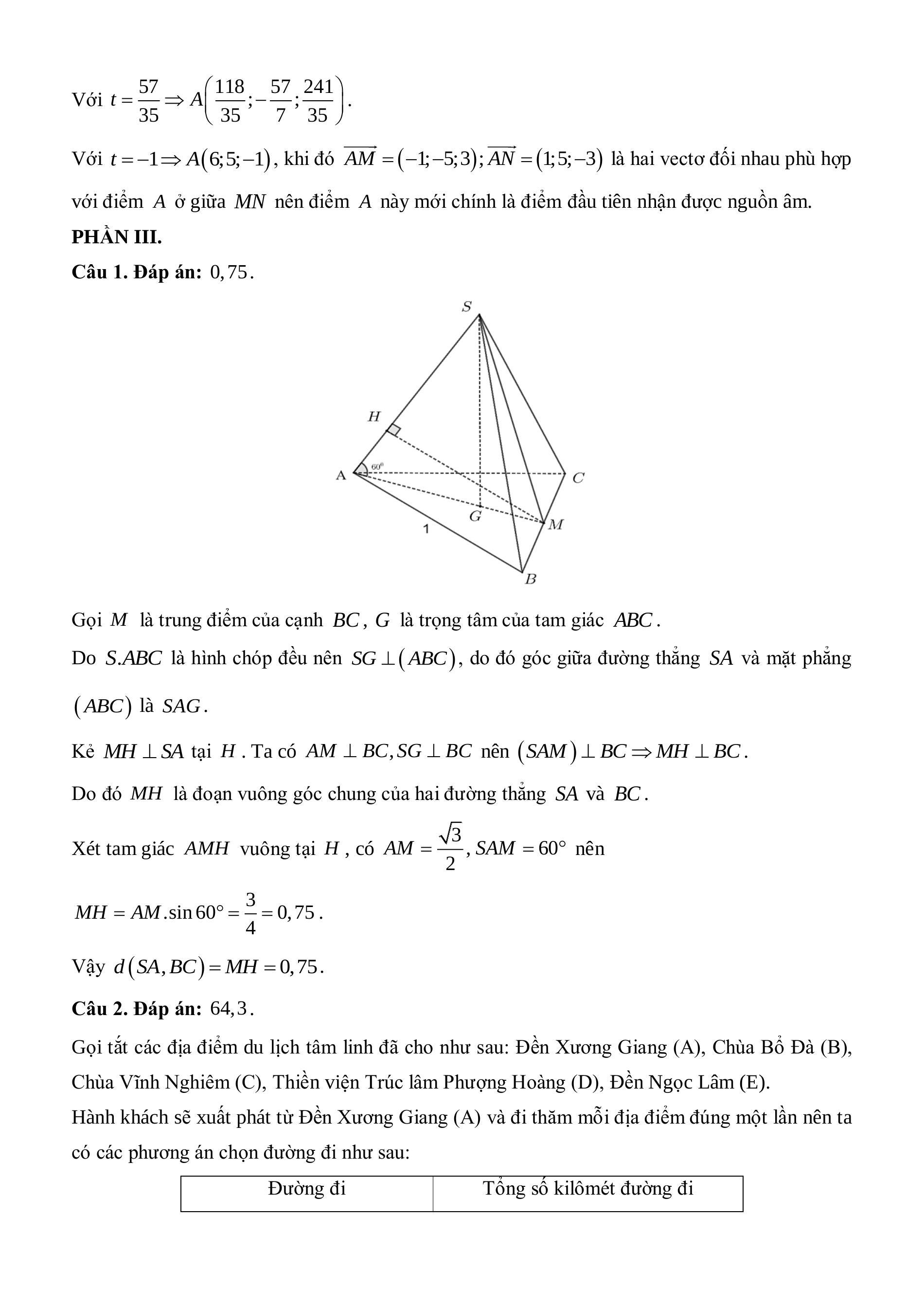 Câu 1. Cho hình chóp đều S.ABC có cạnh đáy bằng 1 . Góc giữa đường thẳng SA và mặt phẳng (ABC) bằng 60∘. Tính khoảng cách giữa hai đường thẳng SA và BC (kết quả viết dưới dạng số thập phân).