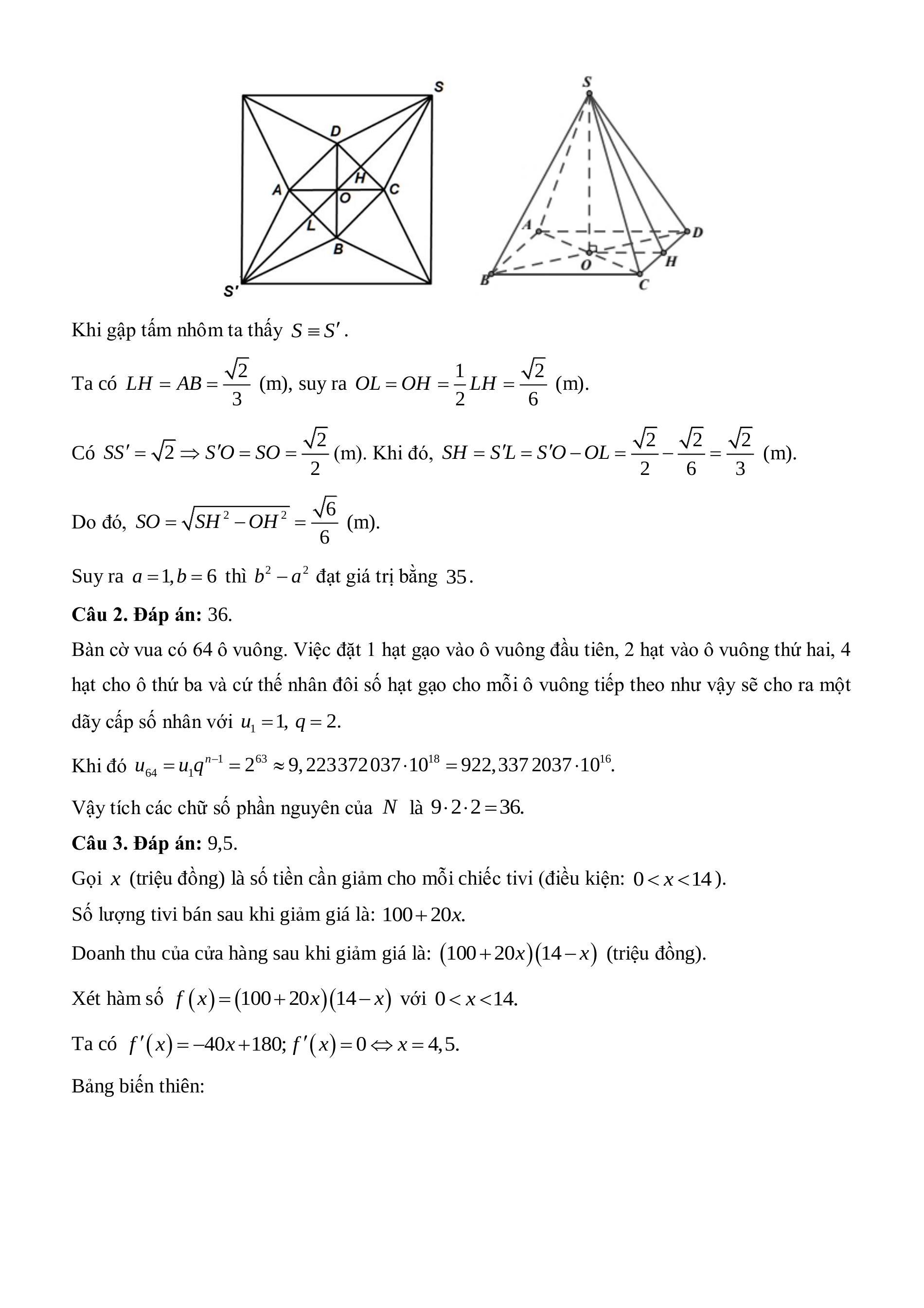 Người ta cắt phần tô đậm của tấm nhôm rồi gập thành hình chóp tứ giác đều có cạnh đáy bằng 32m. Khoảng cách từ đỉnh S tới mặt đáy (ABCD) bằng ba6m, với a,b là các số nguyên dương. Tính giá trị của biểu thức b2−a2.