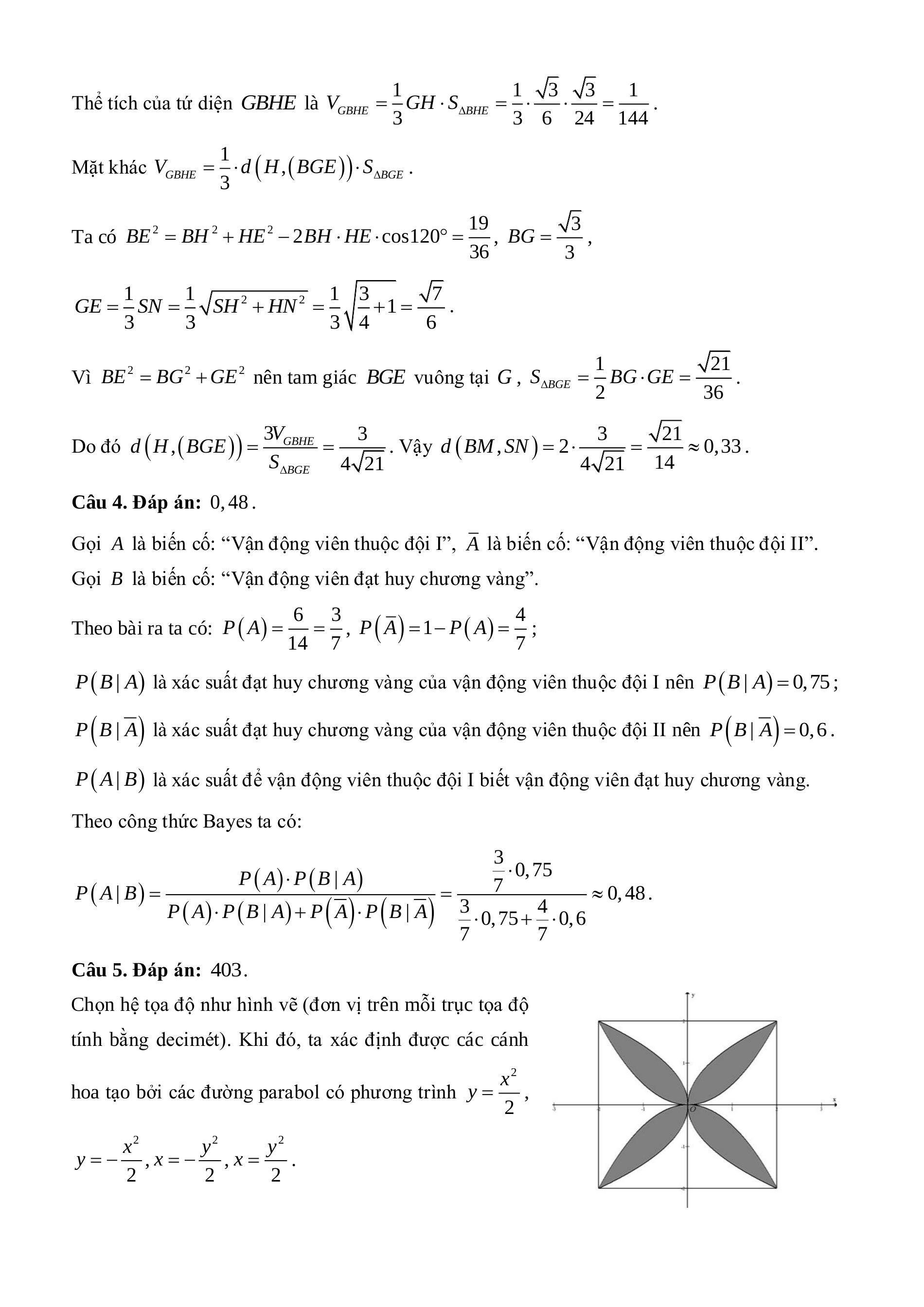 Chọn hệ tọa độ như hình vẽ (đơn vị trên mỗi trục tọa độ tính bằng decimét). Khi đó, ta xác định được các cánh hoa tạo bởi các đường parabol có phương trình , .
