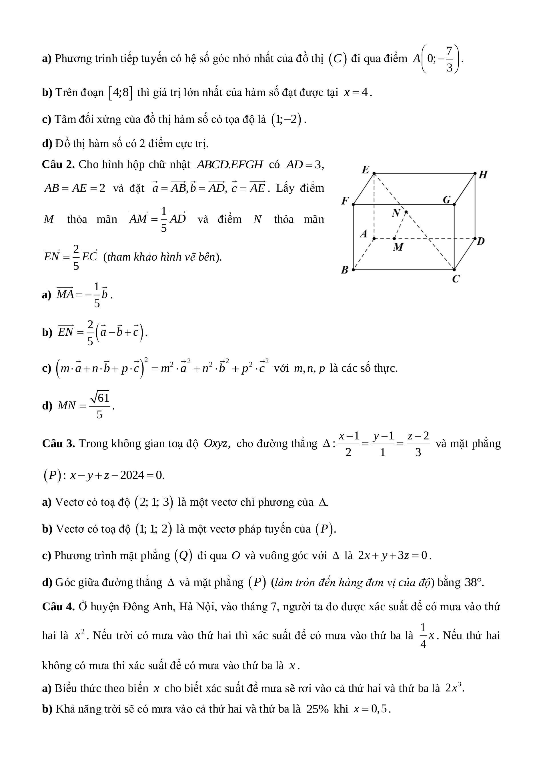 Câu 2. Cho hình hộp chữ nhật ABCD.EFGH có AD=3, AB=AE=2 và đặt a=AB,b=AD,c=AE. Lấy điểm M thỏa mãn AM=51AD và điểm N thỏa mãn EN=52EC (tham khảo hình vẽ bên).