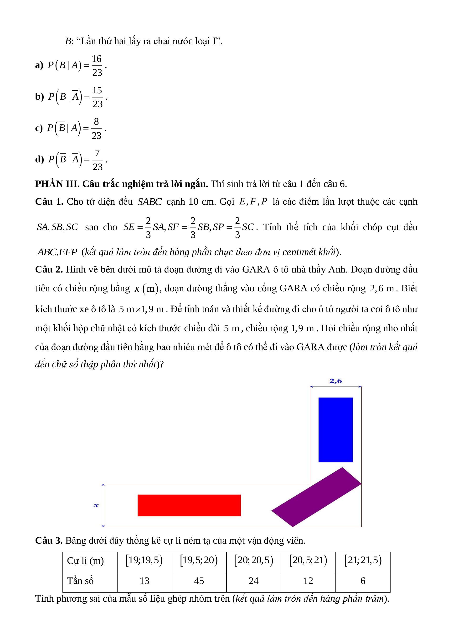 Câu 1. Cho tứ diện đều SABC cạnh 10 cm . Gọi E,F,P là các điểm lần lượt thuộc các cạnh SA,SB,SC sao cho SE=32SA,SF=32SB,SP=32SC. Tính thể tích của khối chóp cụt đều ABC.EFP (kết quả làm tròn đến hàng phần chục theo đơn vị centimét khối).